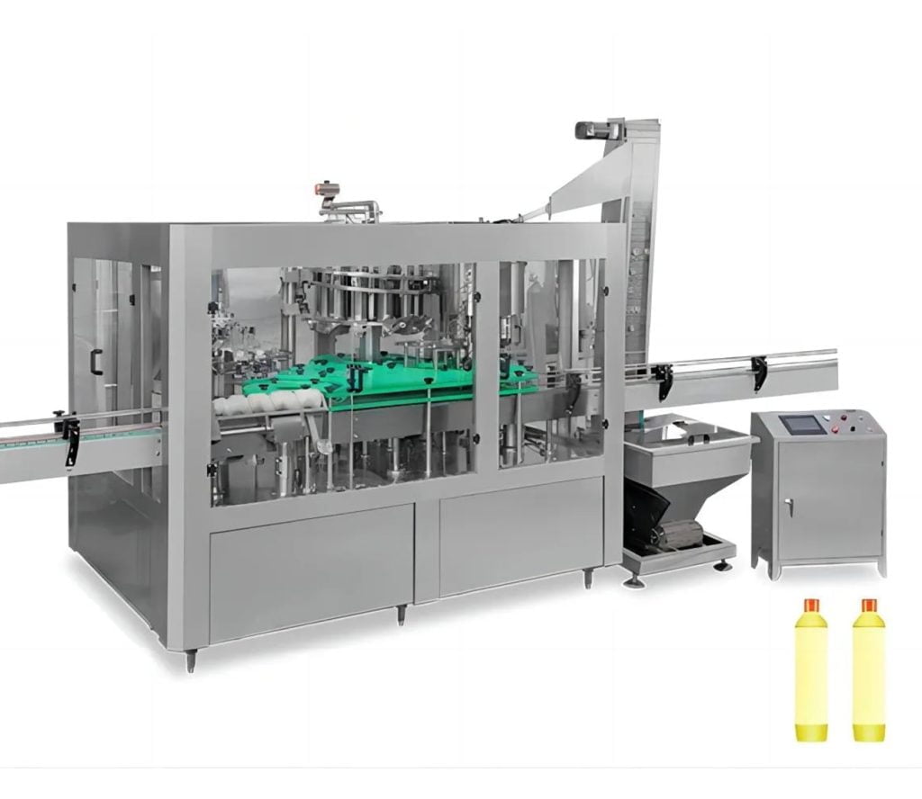 The rotary edible oil production line adopts an anti-drip and wire-drawing filling bulkhead, a filling lifting system to prevent high-foaming products, a positioning system and a liquid level control system to ensure bottle mouth positioning.